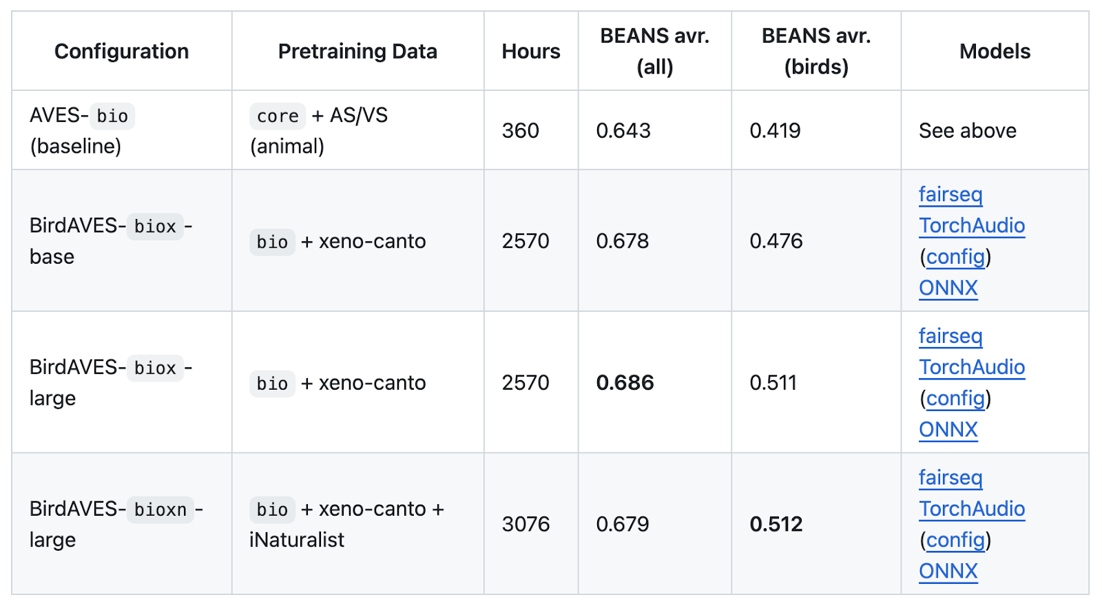 - Training Data: In addition to the core configuration used for AVES, we added a large amount of bird recordings from Xeno-canto and iNaturalist for self-supervised training of BirdAVES models.