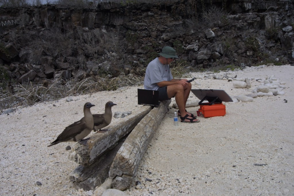 Steve doing a satellite data upload on assignment for MSNBC in the Galápagos Islands