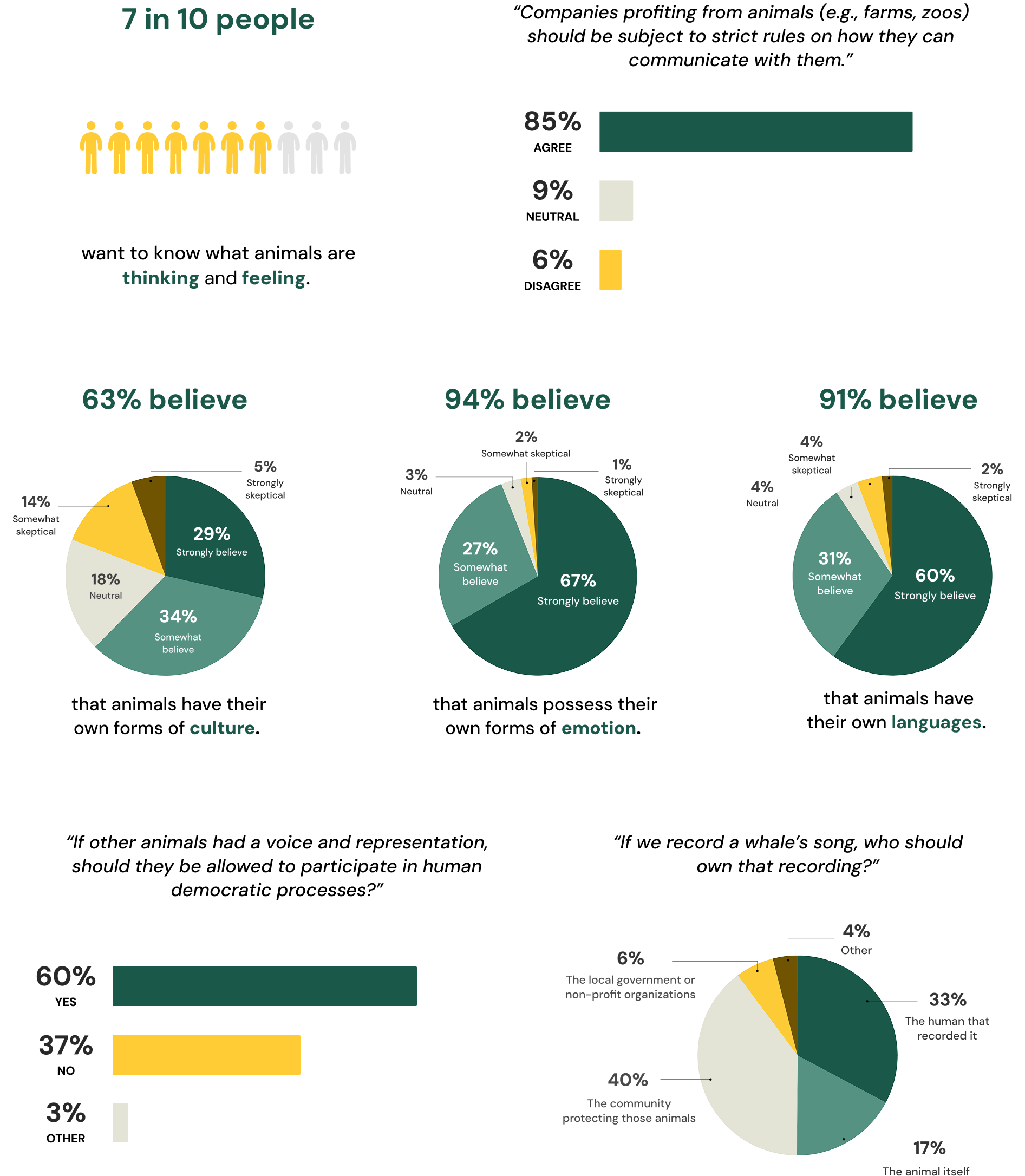 - We surveyed 1,057 people across 67 countries to understand public sentiment on using AI to decode animal communication.